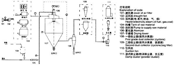 二、工作原理 空氣經(jīng)過濾和加熱,進(jìn)入干燥器頂部空氣分配器,熱空氣呈螺旋狀均勻地進(jìn)入干燥室。料液經(jīng)塔體頂部的高速離心霧化器,(旋轉(zhuǎn))噴霧成極細(xì)微的霧狀液珠,與熱空氣并流接觸在極短的時(shí)間內(nèi)可干燥為成品。成品連續(xù)地由干燥塔底部和旋風(fēng)分離器中輸出,廢氣由風(fēng)機(jī)排空。